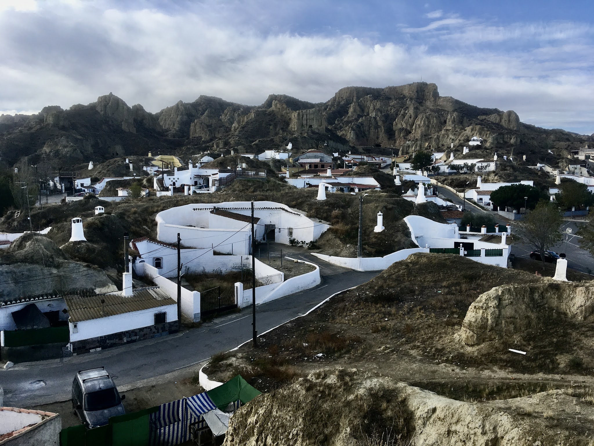 De grotwoningen in Guadix; onder elke schoorsteen bevindt zich een keuken |